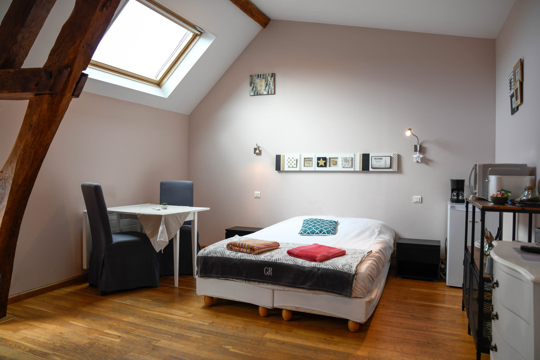 Située au premier étage avec accès indépendant, la Chambre Arum est une chambre lumineuse et confortable, idéal pour deux personnes. Elle comprend un lit double (140 cm), un mini salon et un coin repas équipé d’un petit réfrigérateur, d’une cafetière filtre, d’une bouilloire, d’un micro-ondes, d’un grille-pain et de la vaisselle nécessaire. La salle d’eau privative dispose d’une douche, d’un lavabo et de toilettes. Elle est proposée sans petit déjeuner.